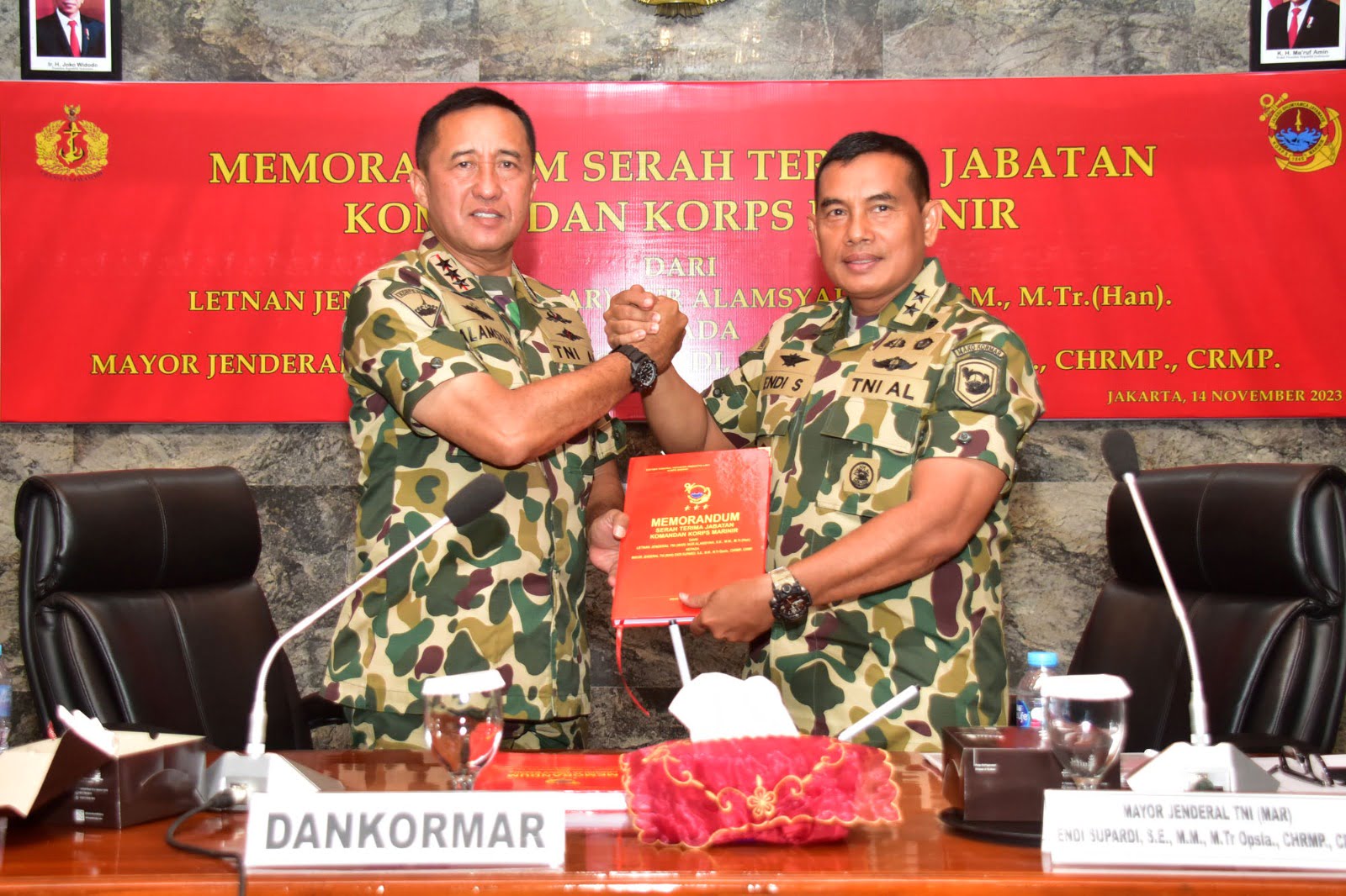 JABARTANDANG.COM,” – Dispen Kormar, TNI Angkatan Laut (Jakarta). Sehari sebelum Serah Terima Jabatan (Sertijab) Komandan Korps Marinir, dilaksanakan memorandum Serah Terima Jabatan Komandan Korps Marinir (Dankormar) dari pejabat lama Letjen TNI (Mar) Nur Alamsyah, S.E., M.M., M.Tr (Han) kepada pejabat baru Mayjen TNI (Mar) Endi Supardi, S.E., M.M., M.Tr. Opsla., CHRMP., CRMP, di ruang Rekreasi Batalyon Infanteri 6 Marinir Cilandak, Jakarta Selatan. Selasa (14/11/2023).