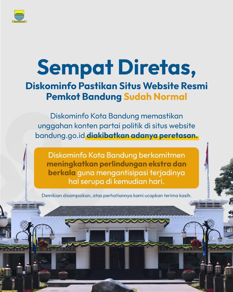 “Sempat terjadi peretasan di website resmi Pemkot Bandung (bandung.go.id). Kami telah berupaya untuk melakukan tindakan penanggulangan dan pemulihan guna menormalkan kembali layanan dari website resmi Pemkot Bandung,” ujar Kepala Diskominfo Kota Bandung, Yayan A. Brilyana.