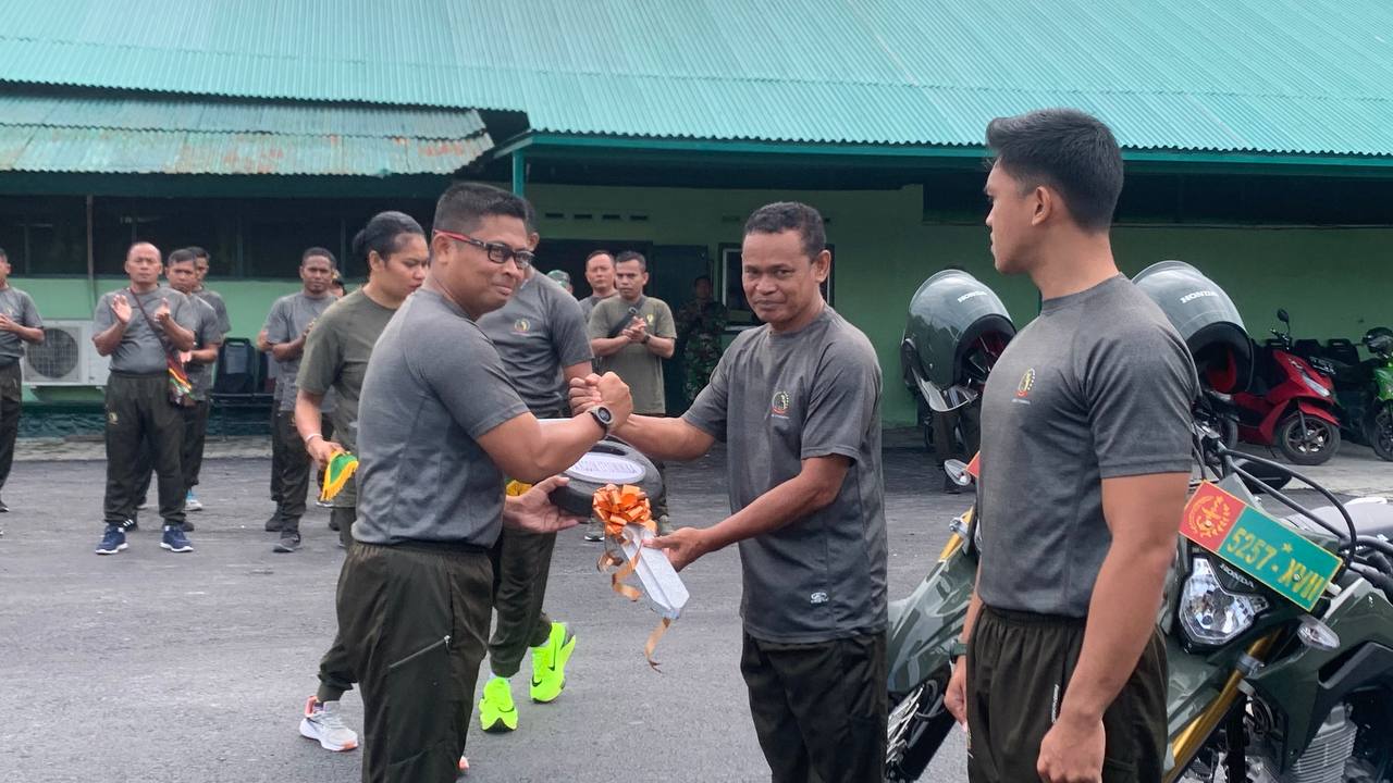JABARTANDANG.COM,” Timika – Komandan Kodim 1710/Mimika Letkol Inf Dedy Dwi Cahyadi menyerahkan 70 unit sepeda motor jenis trail CRF 150 L bantuan dari Kemenhan RI kepada personel Kodim 1710/Mimika usai pelaksanaan apel pagi yang dilaksanakan secara simbolis, bertempat di depan Aula BMP Makodim 1710/Mimika, Jl. Agimuga Mile 32 Distrik Kuala Kencana, Kab. Mimika, Jumat (24/11/2023).